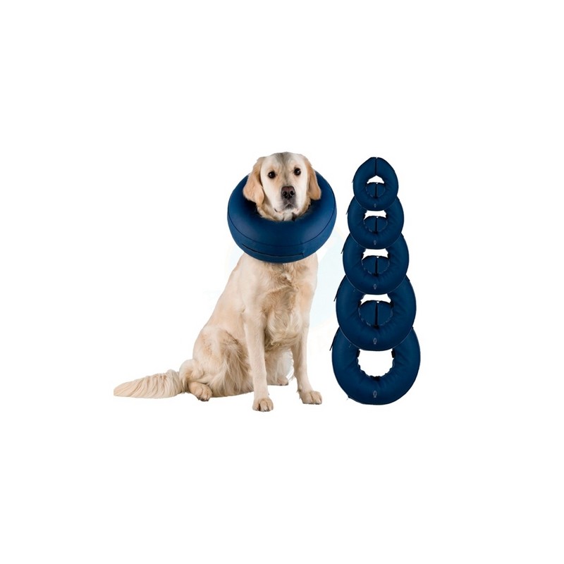 Collare elisabetta gonfiabile, morbido e regolabile. Può essere facilmente messo al collo del vostro animale, impedendogli di mordere una ferita, un eczema o altro. Sono protetti la testa, il torace e la zona posteriore. Il cane può mangiare, bere, annusare e giocare senza particolari restrizioni. Ha la chiusura a strappo e gli occhielli per fissarlo al collare. Diversamente dal classico collare elisabettiano non blocca la visuale, e il vostro cane sarà più contento di portarlo. Il collare gonfiabile è costituito da una camera d’aria interna in plastica, che può essere gonfiata attraverso una valvola a due vie come quella di un pallone da gioco. La camera interna è protetta da un flessibile involucro esterno in plastica. Quest’ultimo è isolato con un tessuto robusto contro eve