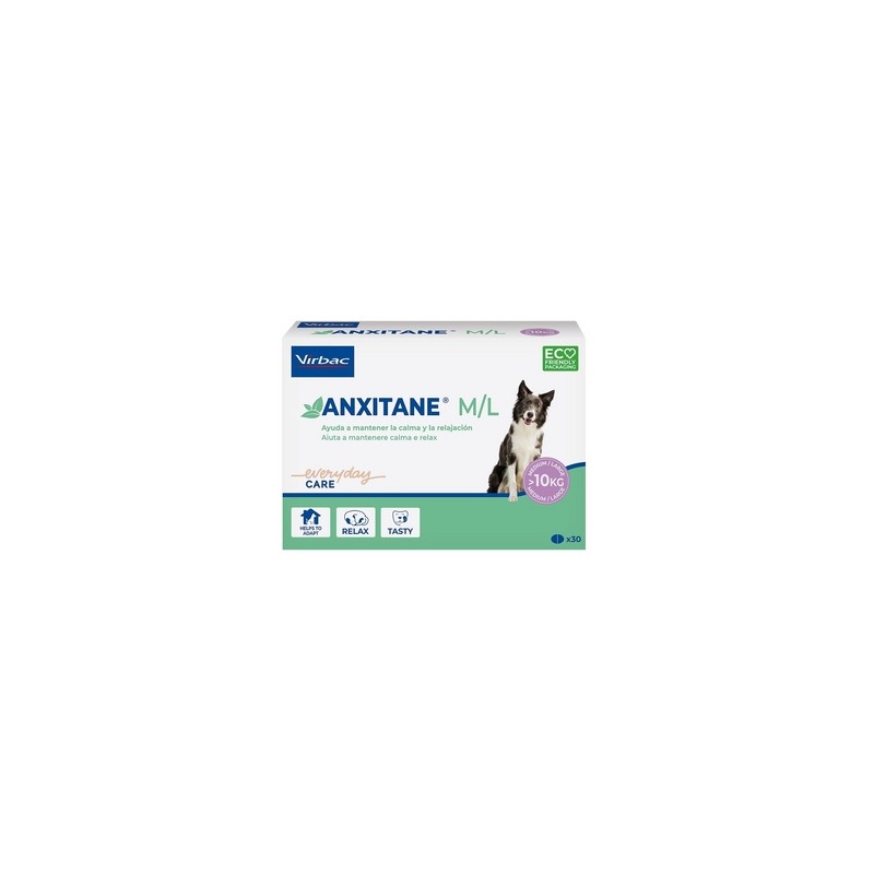 Anxitane è un mangime complementare appetibile studiato per aiutare a mantenere i cani e i gatti calmi e rilassati. Anxitane fornisce L-Teanina derivata da un concentrato naturale di tè verde. La L-Teanina è nota per i suoi benefici sul comportamento: - Attenua le reazioni allo stress e alla paura, associate o no a cambiamenti dell’ambiente in cui vive l’animale (paura della gente, paura degli altri animali, paura fuori casa, cambiamenti nell’ambiente in cui vive, fuochi d’artificio); - Consente di aumentare la concentrazione nell’apprendimento; - Ha effetti rilassanti senza causare sonnolenza. ISTRUZIONI PER L’USO: Cani < 10 kg & Gatti: 1/2 compressa di Anxitane S mattina e sera. 10 kg < Cani < 25 kg: 1/2 compressa di Anxitane M/L mattina e sera. Cani > 25 kg: 1 co