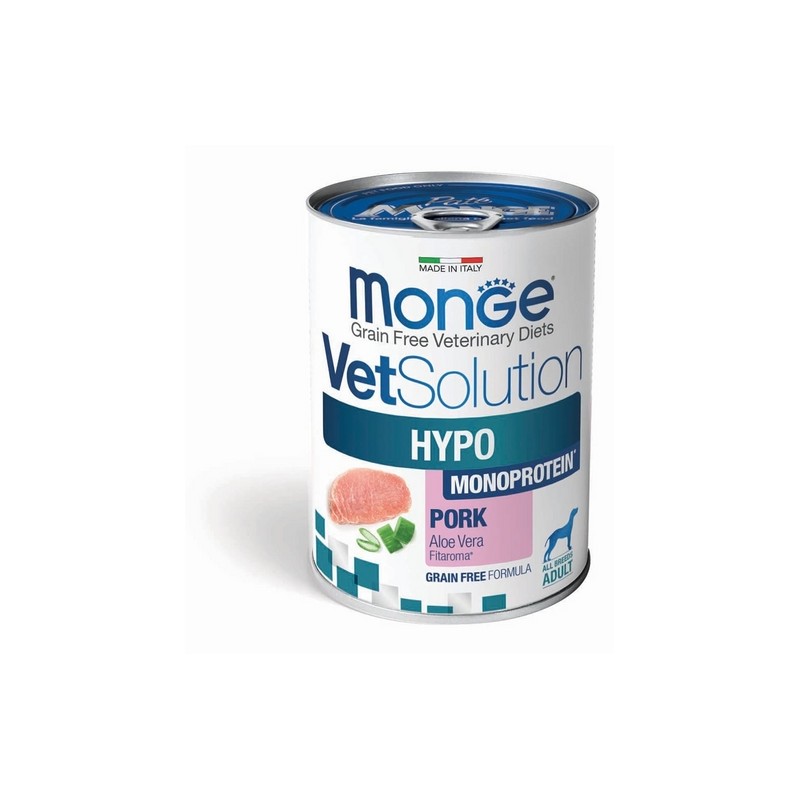 MONGE VETSOLUTION CANINE HYPO MONOPROTEIN* MAIALE è un alimento dietetico completo per cani formulato per la riduzione di intolleranze a ingredienti e sostanze nutritive. Contiene Nucleotidi per favorire la rigenerazione del derma, Aloe Vera per il supporto cutaneo, Xilooligosaccaridi (XOS) per preservare il microbiota intestinale. La formulazione è caratterizzata da fonte selezionata di proteine (Maiale) e in numero limitato e fonte selezionata di carboidrati (amido di patate). *Prodotto formulato con un’unica fonte proteica animale. COMPOSIZIONE: Maiale (65%), amido di patate, prodotti del lievito (1%, idrolizzati di cui nucleotidi liberi 44%), sostanze minerali, xilo-oligosaccaride (XOS 0,4%), Aloe vera (0,01%). Fonte selezionata di proteine: Maiale. Fonte selezionata di carboidrati: amido di patata. COMPONENTI ANALITICI: Proteina grezza: 7,5%, Fibra grezza: 0,5%, Grassi grezzi: 8,5%, Ceneri grezze: 2%, Umidità: 80 %, Acidi Grassi Omega-3: 0,2%, Energia Metabolizzabile: 1.124 kcal/kg. ADDITIVI: ADDITIVI NUTRIZIONALI/kg: Vitamina A (acetato di retinile) 4.500 UI, Vitamina D3 252 UI, Vitamina E (tutto-rac-alfa-tocoferile acetato 3a700i) 30 mg, Zinco (ossido di zinco 20 mg) 16 mg. ISTRUZIONI PER L’USO: Si raccomanda di chiedere il parere di un veterinario prima dell’uso e prima di estendere il periodo di impiego. Periodo di impiego raccomandato da tre a otto settimane. Se i sintomi di intolleranza scompaiono, il mangime può essere impiegato inizialmente !no a un anno. Somministrare 550 g al giorno per cane adulto di 10 kg. La razione giornaliera raccomandata può essere suddivisa in 2 pasti giornalieri. Da servire a temperatura ambiente. Conservare in frigorifero dopo l’apertura e consumare entro 24 ore. *Può contenere tracce di altre fonti proteiche. Mangime per animali non idoneo al consumo umano. MODALITÀ DI CONSERVAZIONE: Conservare in un luogo fresco e asciutto. Da consumarsi preferibilmente entro/Lotto N.: vedi stampigliatura. QUANTITÀ NETTA: 400g