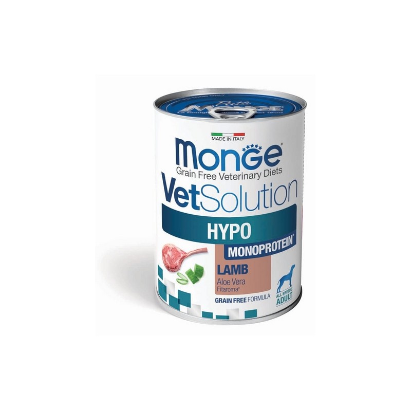 MONGE VETSOLUTION CANINE HYPO MONOPROTEIN* AGNELLO è un alimento dietetico completo per cani formulato per la riduzione di intolleranze a ingredienti e sostanze nutritive. Contiene Nucleotidi per favorire la rigenerazione del derma, Aloe Vera per il supporto cutaneo, Xilooligosaccaridi (XOS) per preservare il microbiota intestinale. La formulazione è caratterizzata da fonte selezionata di proteine (Agnello) e in numero limitato e fonte selezionata di carboidrati (amido di patate). *Prodotto formulato con un’unica fonte proteica animale. COMPOSIZIONE: Agnello (65%), amido di patate, prodotti del lievito (1%, idrolizzati di cui nucleotidi liberi 44%), sostanze minerali, xilo-oligosaccaride (XOS 0,4%), Aloe vera (0,01%). Fonte selezionata di proteine: Agnello. Fonte selezionata di carboidrati: amido di patata. COMPONENTI ANALITICI: Proteina grezza: 7%, Fibra grezza: 0,5%, Grassi grezzi: 6,5%, Ceneri grezze: 2%, Umidità: 80,5%, Acidi Grassi Omega-3: 0,2%, Energia Metabolizzabile: 1.005 kcal/kg. ADDITIVI: ADDITIVI NUTRIZIONALI/kg: Vitamina A (acetato di retinile) 4.500 UI, Vitamina D3 252 UI, Vitamina E (tutto-rac-alfa-tocoferile acetato 3a700i) 30 mg, Zinco (ossido di zinco 20 mg) 16 mg. ISTRUZIONI PER L’USO: Si raccomanda di chiedere il parere di un veterinario prima dell’uso e prima di estendere il periodo di impiego. Periodo di impiego raccomandato da tre a otto settimane. Se i sintomi di intolleranza scompaiono, il mangime può essere impiegato inizialmente !no a un anno. Somministrare 600 g al giorno per cane adulto di 10 kg. La razione giornaliera raccomandata può essere suddivisa in 2 pasti giornalieri. Da servire a temperatura ambiente. Conservare in frigorifero dopo l’apertura e consumare entro 24 ore. Consumare in luogo fresco e asciutto. *Può contenere tracce di altre fonti proteiche. Mangime per animali non idoneo al consumo umano. MODALITÀ DI CONSERVAZIONE: Conservare in un luogo fresco e asciutto. Da consumarsi preferibilmente entro/Lotto N.: vedi stampigliatura. QUANTITÀ NETTA: 400g