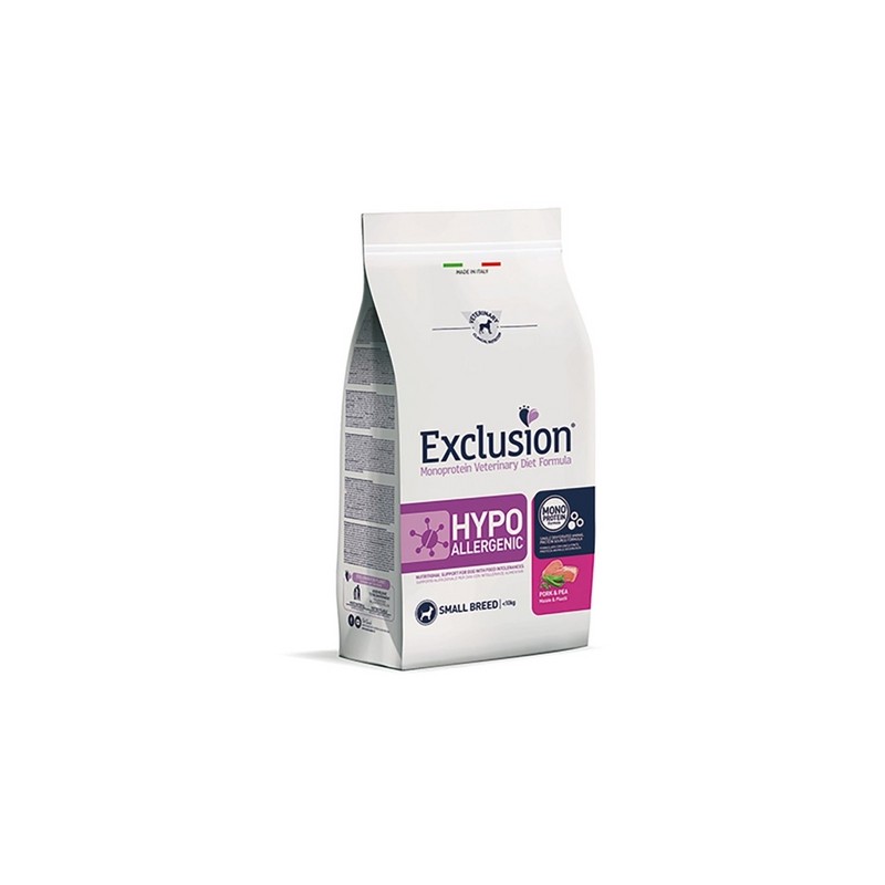 Exclusion Diet Hypoallergenic Small Breed Maiale e Piselli è l’alimento secco completo e bilanciato per cani di taglia piccola ideale per la riduzione delle intolleranze e allergie legate a determinati ingredienti. Caratteristiche Exclusion Diet Hypoallergenic Small Breed Maiale e Piselli è l’alimento secco completo e bilanciato per cani di taglia piccola ideale per la riduzione delle intolleranze e allergie legate a determinati ingredienti. L’utilizzo della proteina della carne di maiale e dei piselli come fonte di carboidrati rende la speciale formula Exclusion Diet Hypoallergenic la soluzione ideale per ridurre il rischio di reazione allergica. La linea Hypoallergenic, è la linea di Exclusion che comprende alimenti monoproteici e monocarboidrato, ipoallergenici, in cui si esclu