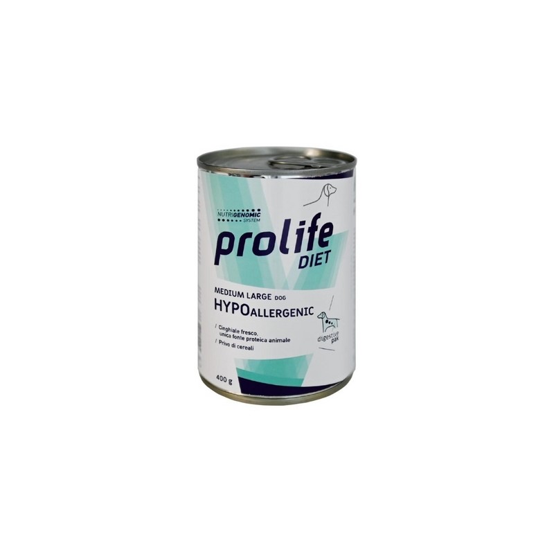 Il cibo umido per cani Prolife Diet Hypoallergenic è un alimento completo dietetico, specifico per cani ipersensibili o intolleranti a ingredienti e/o sostanze nutritive. Realizzato con un’unica fonte proteica, è arricchito con Vitamina E e acidi grassi che contribuiscono a ridurre i processi infiammatori a carico della cute e del sistema digestivo. Cinghiale fresco 65%, Zucca 5%, Alltech® Nutrigenomic System Digestive Pak* 1,2%, Sostanze minerali, Olio di canapa 0,4%, Fruttoligosaccaridi 0,1%, Mannanoligosaccaridi 0,1%, Yucca schidigera 0,05%. *da Alltech® Nutrigenomic System Digestive Pak: Lievito essiccato da Saccharomyces cerevisiae, Alghe essiccate (schizochytrium sp.), Derivato del lievito da S. cerevisiae, Yucca schidigera, Acidi grassi (butirrico) esterificati con glicerolo, Alg