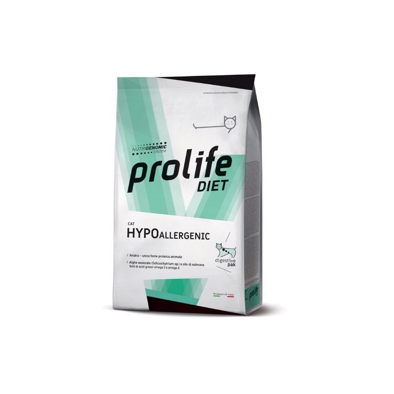 Prolife Veterinary Diet Cat Hypoallergenic Anatra è l'alimento completo dietetico per il gatto formulato per la riduzione di intolleranze a ingredienti e sostanze nutritive.