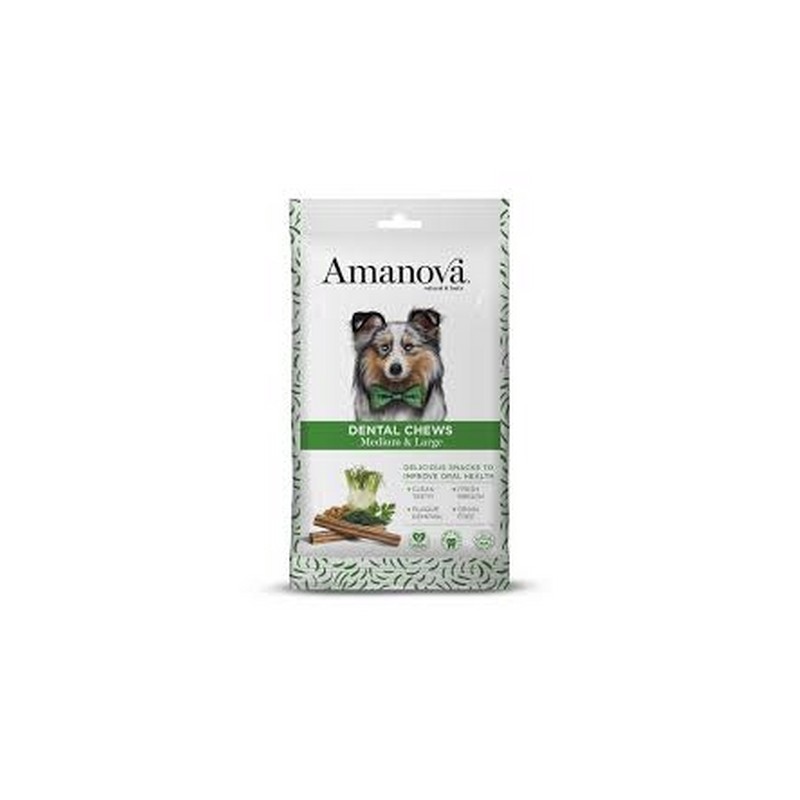Dental Chews Snack dentale Medium / Large Vogliamo aiutarti a prenderti cura della salute dentale del tuo migliore amico. Ecco perché abbiamo creato i nostri stick dentali, una soluzione deliziosa ed efficace (che funge da spazzolino e dentifricio) che aiuterà a pulire i suoi denti in modo sicuro ed efficace. La nostra ricetta 100% naturale comprende ingredienti come finocchio, radice di liquirizia, prezzemolo, alghe e olio di eucalipto, che aiutano a ottenere una pulizia profonda, prevenendo l'accumulo di placca batterica e mantenendo i denti puliti e sani, inoltre, i nostri bastoncini aiutano a rinfrescare l'alito del tuo fedele amico, un grande sollievo per tutta la famiglia! Tutte le nostre ricette sono prive di cereali, altamente digeribili e hanno grandi benefici sia per i d