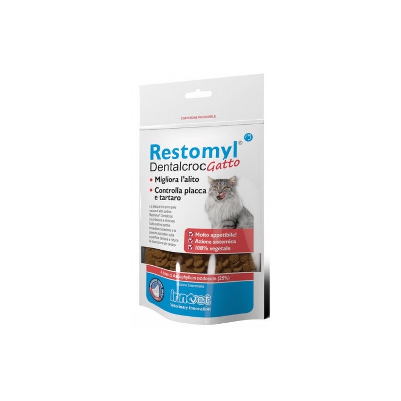 Supporto nutrizionale per la salute del cavo orale del cane e del gatto. Previene la formazione e l’adesione della placca sulla superficie dentaria, migliorando l’alito e rallentando la deposizione del tartaro. Restomyl® Dentalcroc non è un farmaco veterinario, ma un alimento complementare per cani e gatti. Se il tuo cane (o gatto) ha l’alito cattivo (tecnicamente si parla di alitosi), molto probabilmente soffre di un problema legato all’igiene orale. A differenza di altre misure per il controllo della placca, Restomyl® Dentalcroc agisce per via sistemica. Contiene infatti una particolare alga bruna (Ascophyllum nodosum), il cui uso è stato brevettato e i cui benefici sulla salute del cavo orale sono stati dimostrati specificatamente nell’animale da compagnia*. L’alga bruna viene assorbita dopo somministrazione orale e, attraverso la circolazione, raggiunge le ghiandole salivari per concentrarsi nella saliva. Qui impedisce la crescita sulla superficie dentaria della componente batterica della placca e riduce la deposizione del tartaro. Il primo segno di un miglioramento della salute orale è la scomparsa dell’alito cattivo. Restomyl® Dentalcroc non contiene alcun ingrediente che maschera il cattivo odore dell’alito. Supporto nutrizionale per la salute del cavo orale del cane e del gatto. Previene la formazione e l’adesione della placca sulla superficie dentaria, migliorando l’alito e rallentando la deposizione del tartaro. Restomyl® Dentalcroc non è un farmaco veterinario, ma un alimento complementare per cani e gatti. Se il tuo cane (o gatto) ha l’alito cattivo (tecnicamente si parla di alitosi), molto probabilmente soffre di un problema legato all’igiene orale. A differenza di altre misure per il controllo della placca, Restomyl® Dentalcroc agisce per via sistemica. Contiene infatti una particolare alga bruna (Ascophyllum nodosum), il cui uso è stato brevettato e i cui benefici sulla salute del cavo orale sono stati dimostrati specificatamente nell’animale da compagnia*. L’alga bruna viene assorbita dopo somministrazione orale e, attraverso la circolazione, raggiunge le ghiandole salivari per concentrarsi nella saliva. Qui impedisce la crescita sulla superficie dentaria della componente batterica della placca e riduce la deposizione del tartaro. Il primo segno di un miglioramento della salute orale è la scomparsa dell’alito cattivo. Restomyl® Dentalcroc non contiene alcun ingrediente che maschera il cattivo odore dell’alito.