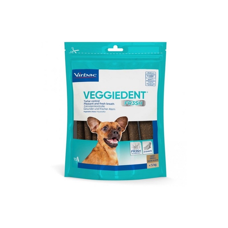 Virbac VeggieDent Fresh sono gli innovativi snack per l'igiene orale del cane. L'esclusiva forma a Z consente allo stick di raggiungere ogni punto della sua bocca. Disponibile in diversi formati a seconda della taglia dell'amico a quattro zampe. Caratteristiche Virbac VeggieDent Fresh sono gli innovativi snack per l'igiene orale del cane. L'esclusiva forma a Z consente allo stick di raggiungere ogni punto della sua bocca. Disponibile in diversi formati a seconda della taglia dell'amico a quattro zampe. Caratteristiche principali dello snack per l'igiene orale: in pratiche confezioni salva freschezza da 15 stick (ogni confezione ha peso diverso) snack differenziato secondo taglia del cane stick dalla forma a Z, ideale per raggiungere ogni punto della bocca del cane con soli ingredienti naturali di origine vegetale, senza ingredienti di derivazione animale e facilmente digeribile gluten free formula ottimo supporto per la salute intestinale di fido. Contiene un prebiotico che aiuta la digestione e aiuta a mantenere il benessere intestinale rapido risultato già dal primo snack: alito fresco fin dal primo giorno. Risultati continui per un periodo di 2 settimane con uso quotidiano 9 proprietari di cani su 10, hanno riscontrato miglioramenti riguardo l’alitosi dei loro cani Specifiche aggiuntive di prodotto: In ogni confezione sono presenti 15 stick e suggeriamo di dare uno stick al giorno per garantire l'efficacia nella prevenzione da Placca e Tartaro. Il Bollo VOHC garantisce che Veggiedent FR3SH è stato validato da un ente terzo in merito all'efficacia nella prevenzione da Placca e Tartaro. Scopri di più sugli snack Virbac per l'alitosi del cane: La tecnologia FR3SH® offre alito fresco e non solo: un solo stick al giorno riduce tartaro e placca, cause di alitosi. Rinfresca l'alito a ogni morso. Contiene un prebiotico che aiuta la digestione. Snack vegetale per cani che non maschera l'alito cattivo del cane, bensì agisce sulle sue cause. Posologia: 1 stick al giorno per cani sopra i 30 kg 1 stick al giorno per cani tra 10 e 30 kg 1 stick al giorno per cani tra 5 e 10 kg 1 stick al giorno per cani sotto i 5 kg