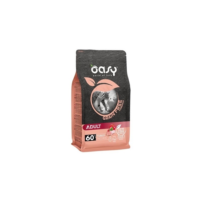 COMPOSIZIONE: tacchino fresco 37% , tacchino disidratato 20% , piselli, proteina di piselli, patate, grasso animale, patata dolce, fegato di tacchino idrolizzato 3% , lievito di birra, polpa di mele 1,5% , proteina di patate, complesso vegetale 0,6% (zucca, spinaci, carote, pomodoro, mirtillo rosso, rosa canina, prezzemolo, salvia, origano, rosmarino), semi di lino, olio di pesce, sostanze minerali, cicoria 0,1% , mannanoligosaccaridi 0,1% , estratto di agrumi, Yucca schidigera. COMPONENTI ANALITICI: proteina grezza 31,5% , grassi grezzi 16,5% , fibre grezze 3% , ceneri grezze 8,5% , calcio 1,3% , fosforo 1,1% . ADDITIVI: ADDITIVI NUTRIZIONALI: Vitamina A 18.000 IU/kg, Vitamina D3 1.650 IU/kg, Vitamina E 600 mg/kg, Vitamina C 100 mg/kg, ferro (solfato di ferro (II) monoidrato) 60 mg/kg, iodio (ioduro di potassio) 2,8 mg/kg, rame (solfato di rame(II) pentaidrato) 8 mg/kg, manganese (solfato manganoso, monoidrato) 6 mg/kg, zinco (ossido di zinco) 96 mg/kg, selenio (selenito di sodio) 0,1 mg/kg, DL- metionina 1.000 mg/kg, taurina 750 mg/kg. ADDITIVI TECNOLOGICI: antiossidanti, bisolfato di sodio 4000mg/kg. SENZA AROMATIZZANTI O COLORANTI ARTIFICIALI AGGIUNTI. SUGGERIMENTI D'USO: il passaggio da un altro alimento ad Oasy deve essere effettuato gradualmente in 7 giorni. La razione giornaliera indicata può variare in base al livello di attività fisica dell'animale. Lascia sempre a disposizione del tuo gatto acqua fresca e pulita. Conservare in luogo fresco e asciutto. Razione giornaliera consigliata g/giorno