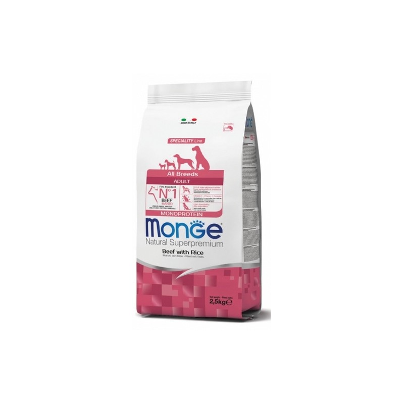 Monge Natual Adult Manzo e Riso è un cibo secco per cani adulti monoproteico. Queste crocchette per cani sono un alimento completo e bilanciato per cani adulti è composto da una singola fonte di proteine animali (manzo). Caratteristiche Monge Natual Adult Manzo e Riso è un cibo secco per cani adulti monoproteico. Queste crocchette per cani sono un alimento completo e bilanciato per cani adulti è composto da una singola fonte di proteine animali (manzo). La carne fresca inclusa nella formula è altamente digeribile e con elevato valore biologico. La ricetta è addizionata in Xilo-oligosaccaridi, ultima generazione di prebiotici, per il benessere intestinale. Caratteristiche principali Monge Manzo e Riso: Cibo Monoproteico Carne fresca Alimento altamente digeribile Benessere intestinale Made in Italy Ingredienti e estratti vegetali Vitamina E e vitamina C può contribuire a neutralizzare i radicali liberi Senza coloranti e conservanti artificiali aggiunti Monge Manzo e Riso è un prodotto formulato con un’unica fonte proteica animale, il manzo è il primo ingrediente, e con l’inclusione di carne fresca per una digeribilità e appetibilità ottimale. La ricetta è inoltre arricchita con prebiotici di ultima generazione xilo-oligosaccaridi (XOS) per il supporto del benessere intestinale e ingredienti ed estratti vegetali, come la radice di echinacea, origano, aglio e estratto di carciofo. Monge Natural Superpremium All breeds Adult Monoprotein è un alimento completo per cani adulti di tutte le taglie. Specificamente sviluppato pensando al benessere del tuo cane, grazie alla presenza di sostanze nutritive di qualità frutto della ricerca Made in Italy. Ingredienti Composizione: Manzo (disidratato 30%, carne fresca 10%), riso (7%), grasso animale (sego purificato al 99,5%), proteina di patate, granturco, polpa di barbabietola essiccata, proteine animali idrolizzate (fegato), lievito di birra, avena, sostanze minerali, prodotti del lievito (mannano oligo saccaridi MOS 1%), xilo-oligosaccaride (XOS 0,3%), yucca schidigera (0,3%), farina di alghe (spirulina – Arthrospira platensis 0,3%), prodotti ottenuti dalla trasformazione di vegetali (radice di Echinacea purpurea 0,2%, Origanum Vulgare 0,1%), aglio essiccato (0,2%), glucosamina, solfato di condroitina. Componenti analitici: Proteina grezza: 27%, Fibra grezza: 2,2%, Grassi grezzi: 16%, Ceneri grezze: 7,5%, Calcio: 1,5%, Fosforo: 1,3%, Acidi Grassi Omega-3: 0,4%, Acidi Grassi Omega-6: 1,6% Energia Metabolizzabile 4.030 kcal/kg. Additivi/kg: Additivi nutrizionali: Vitamina A (acetato di retinile) 33.800 UI/kg, Vitamina D3 1.770 UI/kg, Vitamina E (tutto-rac-alfa-tocoferile acetato) 80 mg/kg, Vitamina C (acido ascorbico) 175 mg/kg, Selenio (Selenito di sodio 0,4 mg/kg) 0,2 mg/kg, Manganese (solfato manganoso monoidrato 96 mg/kg) 31 mg/kg, Zinco (ossido di zinco 183 mg/kg): 147 mg/kg, Rame (solfato di rame (II) pentaidrato 49 mg/kg) 12 mg/kg, Ferro (solfato di ferro (II) monoidrato 319 mg/kg) 105 mg/kg, Iodio (iodato di calcio anidro 2,5 mg/kg) 1,68 mg/kg; L-Carnitina 100 mg/kg; DL-Metionina tecnicamente pura: 1500 mg/kg. Additivi tecnologici: Antiossidanti: Estratti di tocoferolo da oli vegetali. Additivi organolettici: estratto di Castagna (Castanea sativa) 20 mg/kg, estratto di Carciofo (Cynara scolymus L.) 300 mg/kg. Istruzioni per l'uso: La razione giornaliera raccomandata indicata in tabella può essere suddivisa in 2 pasti giornalieri. Le quantità possono essere adattate a seconda della taglia, età e delle condizioni di vita dell’animale. Lasciare sempre a disposizione acqua fresca e pulita. Quando il prodotto va a sostituire un altro tipo di mangime e/o tipo di alimentazione si consiglia di introdurlo gradualmente, in almeno 1 settimana di tempo. *Può contenere tracce di altre fonti proteiche. Alimento per cani non utilizzabile per alimentazione umana.