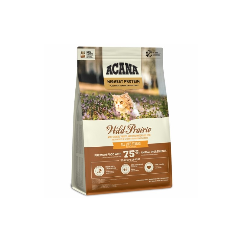 I gatti necessitano di una dieta ricca di proteine animali. Questa necessità è determinata dalla loro costituzione fisiologica e dalla loro natura carnivora. Ispirato alle vaste praterie canadesi e ai laghi incontaminati, ACANA Wild Prairie offre al vostro gatto ingredienti animali di alta qualità, come pollo e tacchino allevati all'aperto, pesce d'acqua dolce e uova allevate in fattoria. Di conseguenza, ACANA è ricca di proteine e nutrienti provenienti dalla carne dei muscoli, dagli organi interni, dalla cartilagine e dalle ossa presenti nelle proporzioni WholePrey dei nostri alimenti. In questo modo si assicura che il gatto riceva tutto ciò di cui ha bisogno per raggiungere la piena salute. Componenti analitici Proteina grezza (37%), lipidi grezzi (18%), ceneri grezze (9%), fibra g