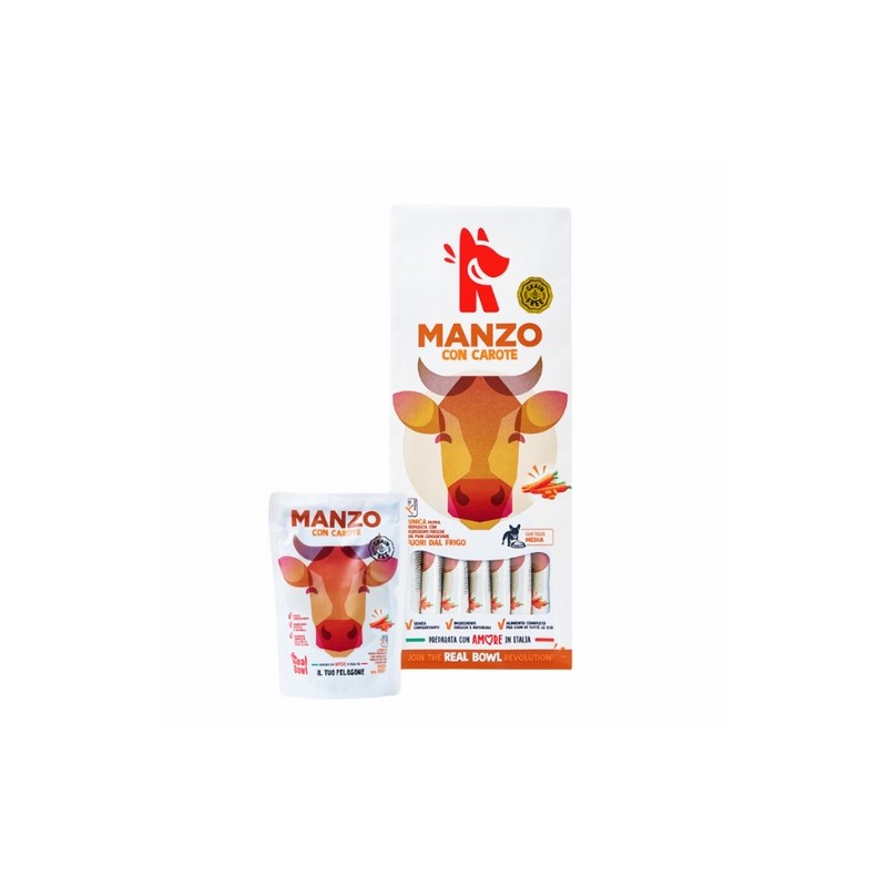 Real Bowl Dog All Breeds Grain Free 150 gr è il ragù completo per cani di tutte le razze e età, che unisce la praticità delle crocchette ai benefici di una dieta casalinga. Realizzato con ingredienti freschi e naturali, senza conservanti, offre un'alimentazione sana e bilanciata. Caratteristiche: - Ingredienti freschi e naturali: migliorano la digestione e rafforzano il sistema immunitario - Adatto a tutte le razze: ideale per cani di ogni taglia e età - Monoproteico e senza cereali: per una dieta sana e priva di allergeni - Metodo di cottura a vapore: preserva i nutrienti essenziali - Pronto all'uso: non necessita di refrigerazione, perfetto per ogni occasione Real Bowl Dog All Breeds Grain Free 150 gr é l’ unico cibo umido e fresco che non necessita di refrigerazione; un perfetto ragù completo per cani di tutte le razze e di tutte le età che coniuga la comodità delle crocchette con i benefici di una dieta casalinga e che non richiede refrigerazione; è realizzato esclusivamente con ingredienti freschi, naturali e a km 0, senza l’aggiunta di conservanti artificiali e di additivi tecnologici, garantendo un'alimentazione completa, bilanciata, naturale e sana, con lo stesso valore biologico della pappa fatta in casa. L' obiettivo è trasformare ogni pasto del tuo cane in un'esperienza deliziosa, dando la sicurezza di prodotti sani e genuini. Le ricette sono state sviluppate in collaborazione con esperti nutrizionisti, assicurando che ogni pasto sia completo, bilanciato e ricco di nutrienti, focalizzandosi sul benessere dei cani e sulle loro esigenze specifiche. Caratteristiche principali di Real Bowl Dog All Breeds Grain Free 150 gr: Pappa fresca casalinga; Adatto a cani di tutte le razze e taglie; disponibile al gusto manzo o pollo; Monoproteico; senza cereali; senza conservanti artificiali e appetizzanti; Metodo di cottura a vapore; Quantità: Busta singola da 150 gr. Benefici chiave di Real Bowl Dog All Breeds Grain Free 150 gr: Ingredienti freschi e naturali: migliorano la digestione e rafforzano il sistema immunitario, contribuendo ad una pelle sana, un mantello lucido e un’energia ottimale. Ingredienti all’origine destinati al consumo umano: migliorano la qualità nutrizionale e la sicurezza alimentare, riducendo il rischio di contaminazioni e contribuendo ad una salute ottimale del cane. Offrono un’alimentazione naturale e genuina, riducendo il rischio di reazioni avverse. È un pasto completo: garantisce elevati standard di qualità e sicurezza, assicurando che il cibo sia completo e nutriente. Indicazioni e consigli nutrizionali sulla quantità giornaliera: Peso del cane Porzione consigliata 1,5 kg1/2 busta 3,0 kg1 Busta 5,0 kg1 + 1/2 buste 7,5 kg2 buste GUSTO MANZO: Composizione: Manzo (67,8%), carote (14,0%), patate (8,0%), piselli, olio di semi di lino, olio di semi di girasole (1,7%), sostanze minerali, rosmarino (0,3%). Componenti analitici: Umidità 72%, Proteina 11,7%, Grassi grezzi 10,8%, Ceneri grezze 1,45%, Fibre grezze 0,76%. Additivi per Kg: Vitamine: Vitamina A 5978 UI, Vitamina D3 504 UI, Vitamina E 96 mg, biotina 6 µg. Composti di oligoelementi: Zinco (zinco chelato di glicina idrato) 32,0 mg, Rame (rame chelato di glicina idrato) 4,1 mg, Ferro (ferro chelato di glicina idrato) 16,8 mg, Manganese (manganese ossido) 4,0 mg, Iodio (potassio ioduro) 1,44 mg. GUSTO POLLO: