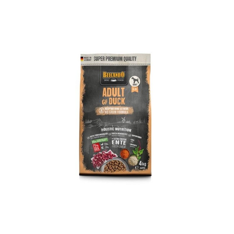 Anatra croccante, che bontà! Vizia il tuo cane con BELCANDO Adult GF Duck. Una ricetta senza cereali che unisce anatra fresca e superfood per un’esperienza gustativa speciale e facilmente digeribile. Il krill fornisce nutrienti preziosi come gli acidi grassi Omega-3, mentre l’amaranto è un’eccellente alternativa ai cereali. Percentuale di proteine animali rispetto alle proteine totali: 75 % (anatra 73 %, krill 2 %) Consigli per l’uso Alimento completo per cani adulti con attività normale o elevata. I valori medi per l’alimentazione di cani adulti sono riportati nella tabella illustrata. Il modo migliore per accertare la dose di alimento richiesta è quello di pesare il cane a regolari intervalli di tempo. Da somministrare a secco. Si raccomanda di mettere sempre a disposizione a