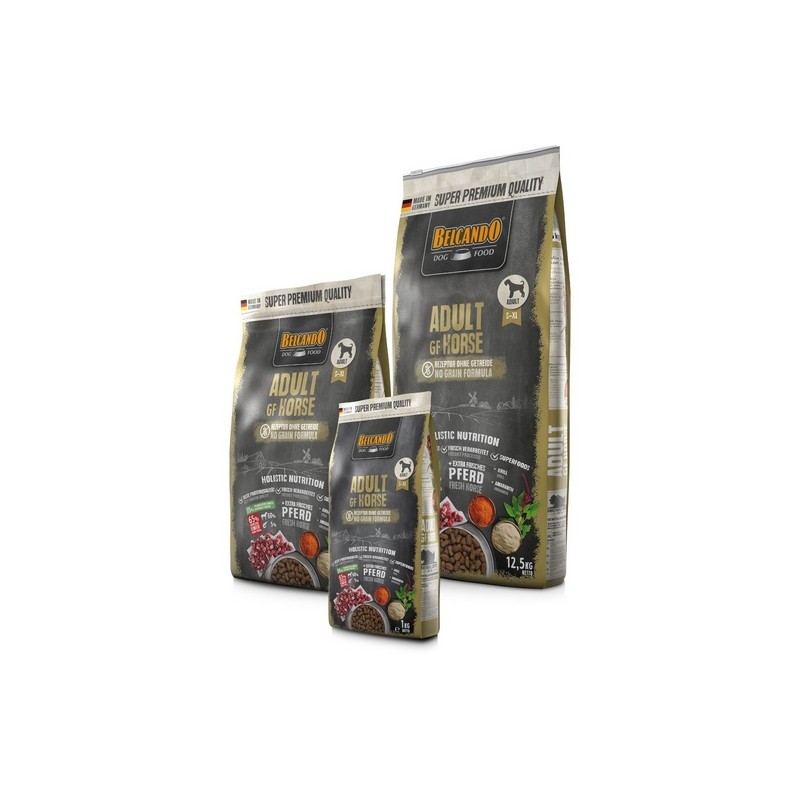 Adult Grain Free Horse Qualità - Made in Germany Per cani adulti con attività normale sensibili ai cereali; La migliore qualità delle proteine; Ricetta senza cereali. Descrizione Per cani adulti con attività normale sensibili ai cereali. Con tanta carne di cavallo fresca e ingredienti selezionati, Belcando® Adult Grain Free Horse è una delizia per i cani. Grazie alla ricetta senza cereali e alla gustosa ed esclusiva varietà di carne, questo alimento secco è particolarmente adatto agli amici a quattro zampe sensibili. Preziosi ingredienti hanno anche contenuti che possono in parte aumentare la vitalità e il benessere del cane. L'amaranto è un'alternativa di alta qualità ai cereali e fornisce importanti nutrienti e sostanze vitali. Con la combinazione con il krill, un prezioso fornitore di acidi grassi omega 3, risulta una ricetta particolarmente equilibrata. Percentuale di proteine animali rispetto alle proteine totali: 65% (di cavallo 60%; krill 5%). Prodotto senza utilizzare: Cereali | Soia | Prodotti a base di latte. Analisi Composizione: Carne, cuore, fegato e polmone di cavallo fresco (40%); farina di piselli; fecola di patate; proteine di cavallo, essiccate (12%); amaranto (5%); farina di fava (Vicia faba); polpa di barbabietola essiccata, dezuccherata; zooplancton marino (krill 2,5%); lievito di birra essiccato; carrube frantumate, essiccate; proteina di piselli; olio di salmone; lievito, idrolizzato; semi di chia; olio di cardo (1%); cloruro di potassio; cloruro di sodio; erbe essiccate (totale: 0,2%; foglie di ortica, radice di genziana, centaurea minore, camomilla, finocchio, cumino, erba di vischio, achillea millefoglie, foglie di rovo). Componenti analitici: Proteine 21,0%; contenuto di grassi 10,0%; ceneri grezze 7,7%; fibra grezza 3,0%; umidità 10,0%; calcio 1,7%; fosforo 1,2%; sodio 0,4%. Additivi per kg: Additivi nutrizionali: Vitamina A 15.000 IU; vitamina D3 1.500 IU; vitamina E 150 mg; taurina 500 mg; L-carnitina 200 mg; rame (solfato di rame II pentaidrato) 12,5 mg; ferro (come solfato ferroso esaidrato) 200 mg; manganese (ossido di manganese II) 40 mg; zinco (ossido di zinco) 125 mg; iodio (come iodato di calcio anidro) 2,0 mg; selenio (selenito di sodio) 0,05 mg. Additivi tecnologici: Estratti di tocoferolo da oli vegetali (vitamina E naturale) 48 mg. Consigli per l'uso I valori medi per l'alimentazione di cani adulti, con livelli di attività normale, sono riportati nella tabella illustrata. Il modo migliore per accertare la dose di alimento richiesta è quello di pesare il cane a regolari intervalli di tempo. Da somministrare a secco. Si raccomanda di mettere sempre a disposizione acqua fresca. Quantità di cibo raccomandata per animale in grammi/al giorno: Peso da adulto Normale: 3 kg 60 g, 5 kg 90 g, 10 kg 150 g, 15 kg 210 g, 20 kg 260 g, 25 kg 310 g, 35 kg 400 g, 50 kg 520 g, 65 kg 630 g, 80 kg 730 g; Peso da adulto Attività ridotta: 3 kg 60 g, 5 kg 80 g, 10 kg 140 g, 15 kg 190 g, 20 kg 230 g, 25 kg 270 g, 35 kg 350 g, 50 kg 460 g, 65 kg 560 g, 80 kg 660 g.