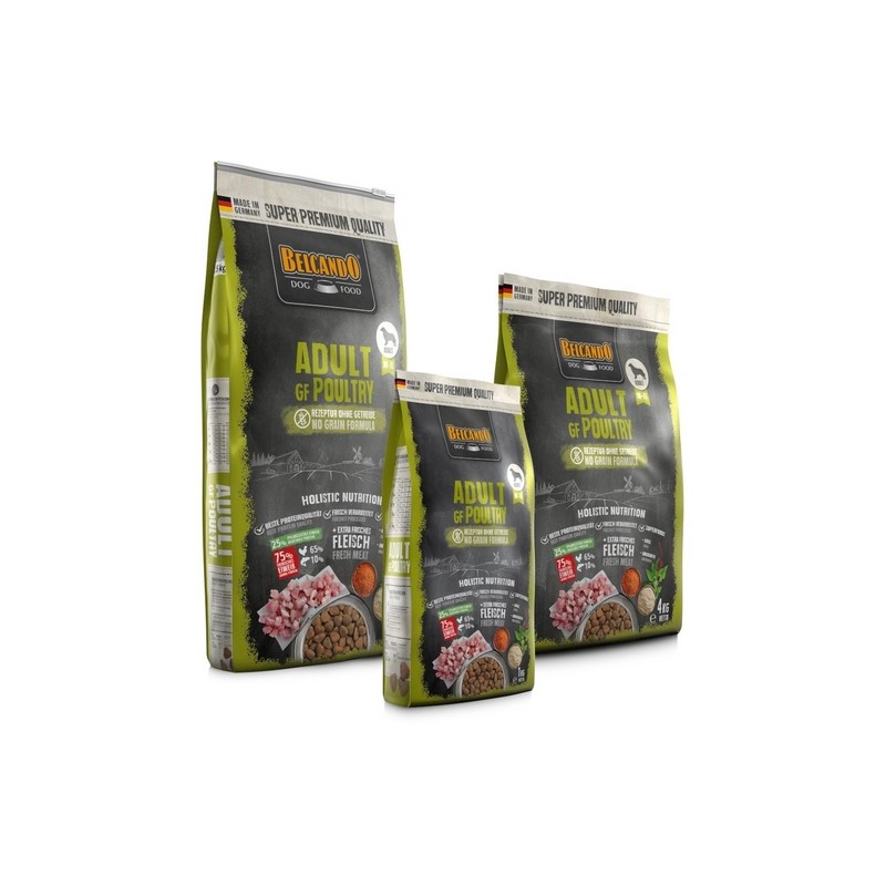 Adult Pollo Qualità - Made in Germany Per cani adulti con livelli di attività normale; Facilmente digeribile; Ricco di amaranto; Ricetta senza cereali. Descrizione: L'alternativa alimentare per cani con intolleranze al glutine e/o ai cereali. In questa formula i cereali sono stati sostituiti con amaranto di alta qualità. L'amaranto è una delle piante commestibili più antiche utilizzate dall'umanità e veniva già apprezzata dagli Aztechi per le sue proprietà energizzanti. In abbinamento al krill, una preziosa fonte di sostanze vitali come gli acidi grassi Omega-3, nasce una ricetta particolarmente bilanciata. Grazie ad un ridotto contenuto di proteine e grassi, Belcando Adult GF Poultry è indicato per il fabbisogno di cani con livello di attività normale. Percentuale di proteine animali rispetto alle proteine totali: 75% (pollame 65%, pesce 10%). Prodotto senza utilizzare: Cereali | Soia | Prodotti a base di latte. Consigli per l'uso: Per cani adulti con attività normale sensibili ai cereali. I valori medi per l'alimentazione di cani adulti sono riportati nella tabella illustrata. Il modo migliore per accertare la dose di alimento richiesta è quello di pesare il cane a regolari intervalli di tempo. Da somministrare a secco. Si raccomanda di mettere sempre a disposizione acqua fresca. Peso ideale con attività normale: 3 kg 60 g, 5 kg 90 g, 10 kg 150 g, 15 kg 200 g, 20 kg 250 g, 25 kg 290 g, 35 kg 370 g, 50 kg 490 g, 65 kg 600 g, 80 kg 700; Peso ideale con livello di attività alto: 3 kg 70 g, 5 kg 100 g, 10 kg 170 g, 15 kg 230 g, 20 kg 280 g, 25 kg 340 g, 35 kg 430 g, 50 kg 570 g, 65 kg 690 g, 80 kg 800. Analisi Composizione: Carne di pollame fresca (40%); amaranto (20%); proteine di pollame, povere di ceneri*¹ (15%); fecola di patate; farina di piselli; zooplancton marino (krill) (2,5%); panello di vinaccioli; lieviti di birra, inattivati*¹; carrube frantumate*¹; grasso di pollame; fosfato dicalcico; farina di pesce da pesce di mare (1 %); semi di chia; fegato di pollame*²; polpa di barbabietola essiccata*³; cloruro di sodio; cloruro di potassio; erbe*¹ (foglie di ortica, radice di genziana, centaurea minore, camomilla, finocchio, cumino, erba di vischio, achillea millefoglie, foglie di rovo) (0,2 %); yucca schidigera. *¹Essiccate *²Idrolizzato *³Dezuccherata. Componenti analitici: Proteine 23,5%; grassi 12,5%; ceneri grezze 7%; fibra grezza 3,5%; umidità 10%; calcio 1,2%; fosforo 0,9%; sodio 0,3%. Additivi per kg: Additivi nutrizionali: Vitamina A 13.000 UI; vitamina D3 1.300 UI; vitamina E 130 mg; taurina 500 mg; rame (solfato di rame (II) pentaidrato) 12,5 mg; ferro (come solfato di ferro (II) monoidrato) 200 mg; manganese (ossido di manganese (II)) 40 mg; zinco (ossido di zinco) 125 mg; iodio (come iodato di calcio anidro) 2 mg; selenio (selenito di sodio) 0,05 mg. Additivi tecnologici: Estratti di tocoferolo da oli vegetali (vitamina E naturale) 48 mg.