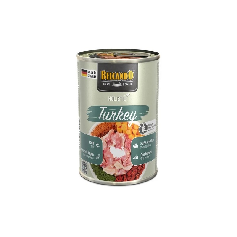 Descrizione Basta aprire il coperchio per rendersi subito conto che all’interno c’è semplicemente di più! Il miglior tacchino con un tocco in più di krill, ricoperto da uno strato di superfood particolarmente delizioso che parla da sé: succose bacche di goji, alghe clorella ricche di energia e irresistibili patate dolci, visibilmente fresche e ricche di sostanze nutritive. Questi ingredienti sono vere e proprie fonti di energia, che forniscono antiossidanti, carboidrati di alta qualità, acidi grassi omega-3, vitamine e altro ancora. Scegliamo consapevolmente ingredienti naturali accuratamente bilanciati ed evitiamo cereali, coloranti artificiali, aromi e conservanti. Per noi, un’alimentazione olistica significa molto più che nutrire il corpo del vostro cane: significa anche sostenere il