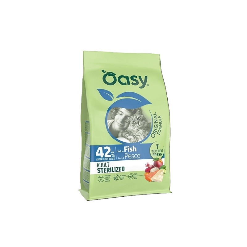 La conservazione dei principi nutritivi della carne fresca di Oasy è garantita dal Fresh Meat Injection System, un'esclusiva tecnologia che l'azienda italiana Oasy ha scelto per garantire la massima qualità. Il pesce viene pescato secondo i metodi ecologici Dolphin-Safe nel rispetto della fauna dell’oceano ed il contenuto minimo di carne e pesce è pari al 40% per soddisfare le esigenze nutrizionali del tuo gatto. Oasy non effettua alcuna sperimentazione su animali, ogni alimento è stato studiato per garantire la massima qualità nel loro pieno rispetto. Con ingredienti naturali, senza l'aggiunta di OGM, soia, coloranti o appetizzanti chimici.