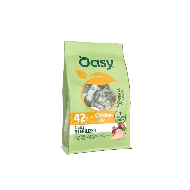 Proprietà Vie urinarie Vie urinarie Cloruro di ammonio per ridurre il Ph delle urine e mantenere il tratto urinario in salute Digestione corretta Digestione corretta Inulina (Fonte di Fos) e prodotti del lievito (Fonte di Mos) per favorire il corretto equilibrio della flora batterica intestinale e migliorare la salute digestiva. Pelle e pelo Pelle e pelo L'apporto corretto di acidi grassi Omega-6, Omega-3, zinco e Vitamina E favorisce una pelle sana e un mantello folto e brillante. Leggi l'etichetta COMPOSIZIONE: pollo fresco 14%, riso 14%, proteine di pollame disidratate 14%, frumento, glutine di granturco, proteine di maiale disidratate 8%, proteine animali disidratate 4%, proteine di pollame idrolizzate 4%, grasso di pollo, granturco, polpa di barbabietola essiccata, lignocellulosa, lieviti inattivati, minerali, polpa di mele essiccata, inulina (fonte di FOS) 0,3%, carote essiccate 0,2%, broccoli essiccati 0,2%, prodotti del lievito (fonte di MOS) 0,2%, Yucca schidigera 0,025%. COMPONENTI ANALITICI: proteina grezza 36%, grassi grezzi 11%, fibre grezze 3,8%, ceneri grezze 8%, calcio 1,25%, fosforo 1,05%, magnesio 0,1%, acidi grassi Omega-3 0,2%, acidi grassi Omega-6 1,9%. ADDITIVI: ADDITIVI NUTRIZIONALI: Vitamina A (3a672a) 27.500 UI/kg, Vitamina D3 (3a671) 1.600 UI/kg, Vitamina E (3a700i) 400 mg/kg, Vitamina C (3a312) 240 mg/kg, Cloruro di colina (3a890) 1.600 mg/kg, DL-metionina, tecnicamente pura (3c301) 2.290 mg/kg, Taurina (3a370) 1.145 mg/kg, L-carnitina (3a910) 460 mg/kg, Rame (3b405) 3,5 mg/kg, Rame (3b413) 1,5 mg/ kg, Ferro (3b103) 57,14 mg/kg, Ferro (3b108) 22,86 mg/kg, Manganese (3b503) 5,63 mg/kg, Manganese (3b506) 1,88 mg/kg, Zinco (3b605) 52,5 mg/kg, Zinco (3b607) 22,5 mg/kg, Iodio (3b201) 2,75 mg/kg, Selenio (3b814) 0,05 mg/kg. ADDITIVI TECNOLOGICI: antiossidanti (estratti di tocoferolo da oli vegetali (1b306(i))).ADDITIVI ZOOTECNICI: Cloruro di ammonio (4d7) 4.000 mg/kg. SENZA AROMATIZZANTI O COLORANTI ARTIFICIALI AGGIUNTI ENERGIA METABOLIZZABILE 3710 Kcal/Kg Suggerimenti d'uso Il passaggio da un altro alimento ad Oasy deve essere effettuato gradualmente in 7 giorni. La razione giornaliera indicata può variare in base al livello di attività fisica dell'animale. Lascia sempre a disposizione del tuo gatto acqua fresca e pulita. Conservare in luogo fresco e asciutto. razione giornaliera consigliata g/giorno Peso del gatto (kg)MantenimentoPerdita di peso 3 - 450 - 6540 - 50 4 - 565 - 7550 - 60 5 - 675 - 8560 - 70 6 - 785 - 9570 - 80 7 - 895 - 10580 - 90