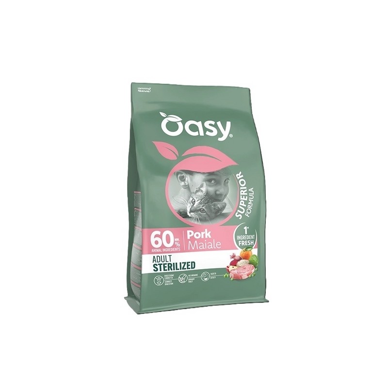 CARNE FRESCA: La carne fresca offre il massimo quanto a digeribilità, assimilazione dei nutrienti e gusto. Le sue proteine mantengono un eccellente valore biologico, i grassi contengono meno radicali liberi e viene assicurata una migliore conservazione delle vitamine. DIGESTIONE: L’inulina è una fonte di prebiotici FOS (Fruttoligosaccaridi) che con i MOS (Mannanoligosaccaridi) favorisce un corretto equilibrio della flora batterica intestinale. La polpa di barbabietola è un’ottima fonte di fibre che contribuisce a migliorare la salute digestiva. VITALITÀ: L’apporto bilanciato di proteine animali di alta qualità e ad alto valore biologico è ideale per aiutare il gatto a mantenersi attivo e in salute. Le proteine della carne sono naturalmente ricche di amminoacidi essenziali per il gatto, fondamentali per supportare tutte le sue funzioni vitali. CUORE: Oasy Adult Maiale contiene il corretto apporto di Taurina, un aminoacido essenziale per il funzionamento del cuore e per la corretta funzionalità della vista del gatto. Inoltre, la Taurina è importante per mantenere un buon tono muscolare per gatti attivi e vitali. SUGGERIMENTI D'USO: il passaggio da un altro alimento ad Oasy deve essere effettuato gradualmente in 7 giorni. La razione giornaliera indicata può variare in base al livello di attività fisica dell'animale. Lascia sempre a disposizione del tuo gatto acqua fresca e pulita. Conservare in luogo fresco e asciutto. Da consumarsi preferibilmente entro, numero di lotto e di stabilimento: vedi sulla confezione. Razionamento e somministrazionePESO DEL GATTO (KG) – MANTENIMENTO/PERDITA DI PESO. 3-4kg - 44-53g/30-37g. 4-5kg-53-61g/37-43g. 5-6kg-61-69g/43-48g. 6-7kg-69-77g/48-53g. 7-8kg-77-84g/53-58g.Componenti analiticiproteina grezza 37%, grassi grezzi 11%, fibre grezze 5%, ceneri grezze 8%, calcio 1,4%, fosforo 1,1%, acidi grassi Omega-3 1%, acidi grassi Omega-6 1,5%.AdditiviADDITIVI NUTRIZIONALI: Vitamina A (3a672a) 20.000 UI/kg, Vitamina D3 (3a671) 1.600 UI/kg, Vitamina E (3a700) 600 mg/kg, Vitamina C (3a312) 100 mg/kg, Ferro (3b103) 75 mg/kg, Rame (3b405) 10 mg/kg, Zinco (3b603) 120 mg/kg, Manganese (3b503) 7,5 mg/kg, Iodio (3b201) 3,5 mg/kg, Selenio (3b801) 0,12 mg/kg, DL-metionina, tecnicamente pura (3c301) 500 mg/kg, Taurina (3a370) 1.200 mg/kg, L-carnitina (3a910) 200 mg/kg. ADDITIVI TECNOLOGICI: antiossidanti (estratti di tocoferolo da oli vegetali (1b306(i))). ADDITIVI ZOOTECNICI: Cloruro di ammonio (4d7) 4.000 mg/kg.Ingredientimaiale fresco 40%, granturco, proteine di maiale disidratate 7%, proteine animalidisidratate 7%, riso, glutine di granturco, piselli, semi di lino, proteine di pollame disidratate 2,6%, lignocellulosa, proteine di pollame idrolizzate 2%, grasso di maiale 2%, pula di riso, polpa di barbabietola, polpa di mele, minerali, lieviti, olio di pesce 0,1%, inulina (fonte di FOS) 0,1%, prodotti del lievito (fonte di MOS) 0,1%, pastazzo di agrumi (pompelmo (Citrus paradisi), mandarino (Citrus reticulata blanco), bergamotto (Citrus aurantium L.), arancia dolce (Citrus sinensis)), Yucca schidigera 0,02%.