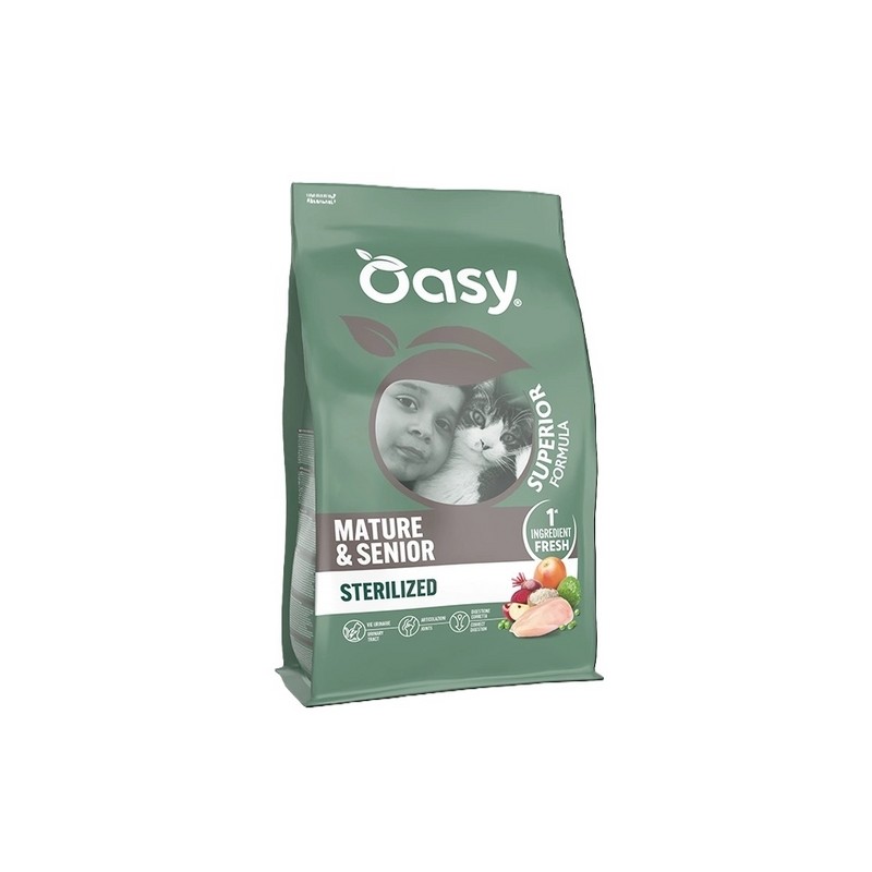 Proprietà Digestione corretta Digestione corretta Inulina (fonte di FOS) e prodotti del lievito (fonte di MOS) per favorire il corretto equilibrio della flora batterica intestinale e migliorare la salute digestiva. Articolazioni Articolazioni L'apporto di glucosamina e solfato di condroitina favorisce la funzionalità delle articolazioni e supporta una corretta mobilità del gatto senior. Vie urinarie Vie urinarie Cloruro di ammonio per ridurre il ph delle urine e mantenere il tratto urinario in salute. Leggi l'etichetta COMPOSIZIONE: pollo fresco 40%, proteine di pollame disidratate 10%, glutine di granturco, granturco, riso, piselli, proteine animali disidratate 7%, semi di lino, lignocellulosa, grasso di pollame 2%, proteine di pollame idrolizzate 2%, polpa di barbabietola, polpa di mele, pula di riso, minerali, olio di pesce 0,4%, lieviti, inulina (fonte di FOS) 0,15%, prodotti del lievito (fonte di MOS) 0,1%, pastazzo di agrumi (pompelmo (Citrus paradisi), mandarino (Citrus reticulata blanco), bergamotto (Citrus aurantium L.), arancia dolce (Citrus sinensis)), Yucca schidigera 0,02%, glucosamina 0,02%, solfato di condroitina 0,003%. COMPONENTI ANALITICI: proteina grezza 35%, grassi grezzi 13%, fibre grezze 5%, ceneri grezze 8%, calcio 1,8%, fosforo 1,2%, acidi grassi Omega-3 0,35%, acidi grassi Omega-6 2,7%. ADDITIVI: ADDITIVI NUTRIZIONALI: Vitamina A (3a672a) 20.000 UI/kg, Vitamina D3 (3a671) 1.600 UI/kg, Vitamina E (3a700) 750 mg/kg, Vitamina C (3a312) 120 mg/kg, Ferro (3b103) 75 mg/kg, Rame (3b405) 10 mg/kg, Zinco (3b603) 120 mg/kg, Manganese (3b503) 7,5 mg/kg, Iodio (3b201) 3,5 mg/kg, Selenio (3b801) 0,12 mg/kg, DL-metionina, tecnicamente pura (3c301) 750 mg/kg, Taurina (3a370) 1.400 mg/kg, L-carnitina (3a910) 200 mg/kg. ADDITIVI TECNOLOGICI: antiossidanti (estratti di tocoferolo da oli vegetali (1b306(i))). ADDITIVI ZOOTECNICI: Cloruro di ammonio (4d7) 4.000 mg/kg. ENERGIA METABOLIZZABILE 3668 Kcal/Kg Suggerimenti d'uso Il passaggio da un altro alimento ad Oasy deve essere effettuato gradualmente in 7 giorni. La razione giornaliera indicata può variare in base al livello di attività fisica dell'animale. Lascia sempre a disposizione del tuo gatto acqua fresca e pulita. Conservare in luogo fresco e asciutto. razione giornaliera consigliata g/giorno Peso del gatto (kg)MantenimentoPerdita di peso 3 - 443 - 5230 - 36 4 - 552 - 6036 - 42 5 - 660 - 6842 - 47 6 - 768 - 7547 - 52 7 - 875 - 8252 - 57