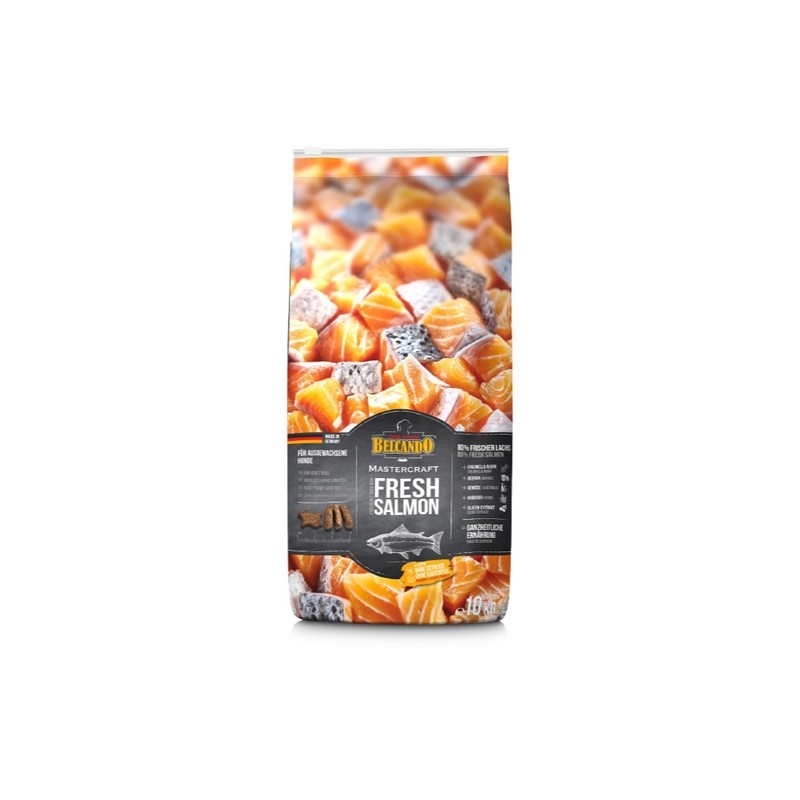 BELCANDO® MASTERCRAFT - Alimenta la differenza! L'alimento secco BELCANDO® MASTERCRAFT è adatto al fabbisogno energetico e nutrizionale dei cani che partecipano in modo attivo alla vita dei loro cari padroni. Questo vale sia per cani di taglia grande che per quelli di taglia piccola, che siano massicci o delicatamente eleganti, la forma della crocchetta è ideale per tutti! Abbiamo riservato particolare importanza allo stesso profilo nutrizionale per ogni varietà. Così puoi cambiare varietà di volta in volta oppure mischiare i gusti senza temere problemi di digestione da parte del tuo cane. Concedi al tuo amico a quattro zampe il gusto pieno della carne con le cinque varietà dell'alimento secco BELCANDO® MASTERCRAFT. Oppure vizialo ogni giorno con il suo gusto preferito. Con BELCANDO® MASTERCRAFT diventi il creatore di menù per il tuo cane. Ad un'alimentazione responsabile associamo freschezza, genuinità ed equilibrio che porta ad una maggiore qualità di vità del tuo cane. Le ricette BELCANDO® MASTERCRAFT sono state create assieme ai nostri nutrizionisti tenendo conto del principio olistico (completo). Utilizziamo materie prime di alta qualità e, se lavorate, lo sono in minimo modo. Queste sono fonti di proteine, grassi e carboidrati. Al primo posto c`è chiaramente la carne fresca che costituisce la quantità più alta nelle nostre ricette. Il cane però non si ciba solo di carne e quindi con la stessa cura abbiamo scelto componenti vegetali quali amaranto, fave e ceci. A queste fonti di principali nutrienti vanno aggiunti ingredienti mirati a completare il profilo nutrizionale del prodotto. Questi presentano in parte componenti che aumentano la vitalità e il benessere dei cani. Sulla base della nostra filosofia olistica creiamo così un alimento che è di più della somma dei suoi componenti. 80 % salmone fresco + alghe chlorella + bacche + verdure + erbe + estratto di olive = Alimentazione completa Garanzia sul prodotto: Ricetta senza cereali, senza patate Non utilizziamo carne disidratata. Senza impiego di coloranti, aromi e conservanti artificiali Consigli per l’uso Quantità di alimento raccomandata per animale in grammi/al giorno Peso da adulto NormaleAttivo 3 kg60 g70 g 5 kg80 g100 g 10 kg140 g160 g 15 kg190 g220 g 20 kg240 g275 g 25 kg280 g325 g 35 kg360 g420 g 50 kg470 g550 g 65 kg580 g665 g 80 kg680 g780 g Analisi Composizione salmone fresco (80 %); amaranto (5,5 %); farina di piselli; farina di fava (Vicia faba); ceci, essiccati; lievito di birra essiccato (1 %, fonte di betaglucani e mannanoligosaccaridi); zooplancton marino macinato (krill, 0,8 %); baccelli di carruba essiccati; residuo della spremitura di mele essiccato; fosfato bicalcico; semi di chia (0,4 %); vegetali, essiccati (totale: 0,3 %; carote, pastinache, barbabietola rossa, porro); maërl (0,3 %, Lithothamnium calcareum); salmone idrolizzato; alghe essiccate (0,2 %, Chlorella vulgaris); cloruro di sodio; ossicocco (0,06 %); frutti di bosco, essiccati (totale: 0,06 %; sorbi selvatici, rosa canina, mirtilli, bacche di sambuco, ribes); erbe essiccate (totale: 0,06 %; foglie di ortica, radice di genziana, centaurea minore, camomilla, finocchio, cumino, erba di vischio, achillea millefoglie, foglie di rovo); cloruro di potassio; yucca schidigera; estratto di olive (0,003 %, Olea europaea) Componenti analitici proteine 27,0 %; contenuto di grassi 15,0 %; ceneri grezze 6,5 %; fibra grezza 3,3 %; umidità 10,0 %; calcio 1,1 %; fosforo 0,9 %; sodio 0,3 % Additivi per kg additivi nutrizionali: vitamina A 13.000 UI; vitamina D3 1.300 UI; vitamina E 130 mg; rame (solfato di rame II pentaidrato) 12,5 mg; ferro (come solfato ferroso esaidrato) 200 mg; manganese (ossido di manganese II) 40 mg; zinco (ossido di zinco) 125 mg; iodio (come iodato di calcio anidro) 2 mg; selenio (selenito di sodio) 0,05 mg additivi tecnologici: estratti di tocoferolo da oli vegetali (vitamina E naturale) 48 mg