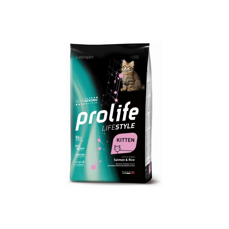 Life Style Kitten Salmon & Rice Alimento completo ricco in SALMONE FRESCO DILISCATO & RISO Salmone Fresco diliscato e Riso per il gattino da 1 a 12 mesi. ? Composizione Salmone 38% (di cui Salmone Fresco diliscato* 27,5%, Salmone disidratato 10,5%), Riso* 24%, Maiale disidratato, Grasso di pollo, Pollo disidratato, Polpa di barbabietola, Lievito di birra, Proteine animali idrolizzate, Alltech® Nutrigenomic System Cats 1,6%, Inulina di cicoria - fonte di FOS - 0,1%, Sostanze minerali. * in origine destinati al consumo umano: materie prime della stessa qualità utilizzata per alimenti per il consumo umano ma non a esso destinate per motivi commerciali ? Componenti analitici Proteina 35%, Tenore in materia grassa 20%, Fibre grezze 1,5%, Materia inorganica 5,9%, Omega 3 1,3