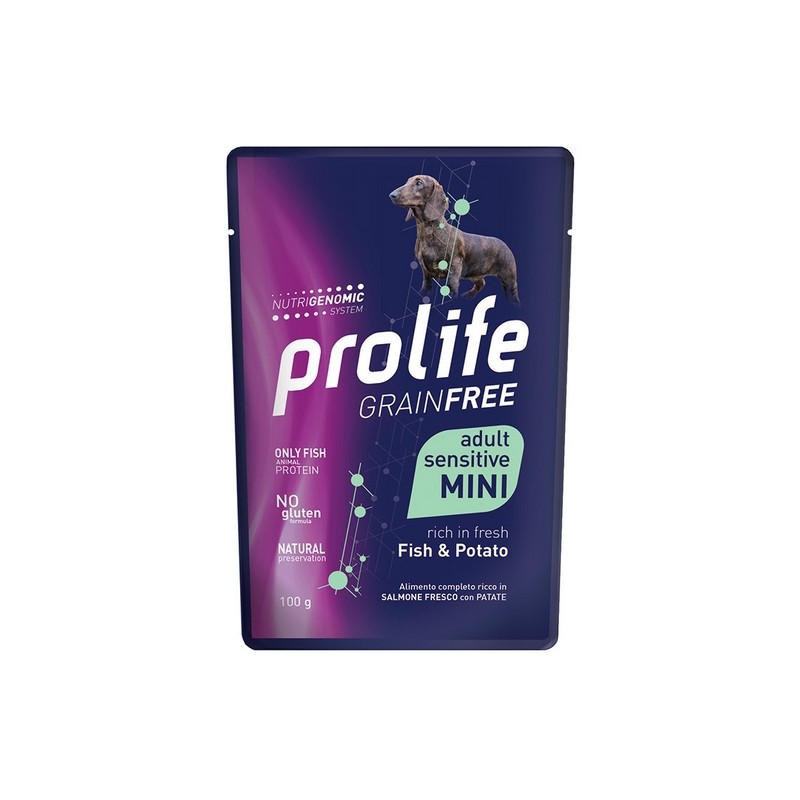 Grain Free Adult Sensitive Fish & Potato - Mini Alimento completo ricco in Salmone Fresco con Patate per il cane adulto sensibile di taglia piccola. ? Composizione Salmone fresco 55%, Pesce bianco fresco 13%, Patate 4%, Sostanze minerali, Alltech® Nutrigenomic System 1,2%, Fruttoligosaccaridi (FOS) 0,11%, Olio di semi di lino 0,1%, Succo di barbabietola disidratato. ? Componenti analitici Proteina 10%, Tenore in materia grassa 8%, Materia inorganica 3%, Fibre grezze 0,8%, Umidità 75%, Calcio 0,3%, Fosforo 0,25%, Omega 3 1,5%, Omega 6 1%. ? Additivi (kg): Additivi nutrizionali Vitamina D3 (3a671) 450 UI, Vitamina E (3a700) 40 mg, Vitamina B1 (3a821) 12 mg, Vitamina B2 9 mg, Vitamina B6 (3a831) 2,5 mg, Vitamina B12 40 mcg, Calcio D-pantotenato (3a841) 20 mg, Biotina (3a880) 0,2 mg, Zinco 30 mg (Ossido di zinco (3b603) 41,7 mg), Manganese 2 mg (Ossido di manganese (II) 3,2 mg), Rame 0,4 mg (Solfato rameico (II) pentaidrato (3b405) 1,6 mg), Iodio 0,3 mg (Iodato di calcio anidro in granuli rivestiti (3b203) 3 mg), L-carnitina (3a910) 800 mg. Energia metabolizzabile 1140 kcal/kg Rapporto calcio/fosforo 1,2 ? Razione Giornaliera consigliata Peso del caneRazione giornaliera da 1 a 2 kgda 110 g a 185 g da 3 a 4 kgda 250 g a 310 g da 5 a 6 kgda 370 g a 425 g da 7 a 8 kgda 475 g a 525 g da 9 a 10 kgda 575 g a 620 g