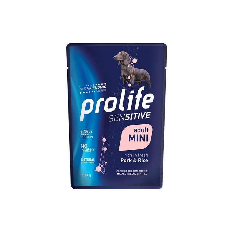 Sensitive Adult Pork & Rice - Mini Alimento completo ricco in Maiale Fresco con Riso per il cane adulto sensibile di taglia piccola. ? Composizione Maiale fresco 68%, Riso 4%, Sostanze minerali, Alltech® Nutrigenomic System 1,2%, Fruttoligosaccaridi (FOS) 0,11%, Olio di semi di lino 0,1%, Succo di barbabietola disidratato. ? Componenti analitici Proteina 10,5%, Tenore in materia grassa 6,5%, Materia inorganica 2%, Fibre grezze 0,8%, Umidità 78%, Calcio 0,3%, Fosforo 0,25%, Omega 3 0,2%, Omega 6 1,1%. ? Additivi (kg): Additivi nutrizionali Vitamina D3 (3a671) 450 UI, Vitamina E (3a700) 40 mg, Vitamina B1 (3a821) 12 mg, Vitamina B2 9 mg, Vitamina B6 (3a831) 2,5 mg, Vitamina B12 40 mcg, Calcio D-pantotenato (3a841) 20 mg, Biotina (3a880) 0,2 mg, Zinco 30 mg (Ossido di zinco (3b603) 41,7 mg), Manganese 2 mg (Ossido di manganese (II) 3,2 mg), Rame 0,4 mg (Solfato rameico (II) pentaidrato (3b405) 1,6 mg), Iodio 0,3 mg (Iodato di calcio anidro in granuli rivestiti (3b203) 3 mg), L-carnitina (3a910) 800 mg. Energia metabolizzabile 1000 kcal/kg Rapporto calcio/fosforo 1,2 ? Razione Giornaliera consigliata Peso del caneRazione giornaliera da 1 a 2 kgda 125 g a 215 g da 3 a 4 kgda 290 g a 360 g da 5 a 6 kgda 425 g a 485 g da 7 a 8 kgda 545 g a 600 g da 9 a 10 kgda 655 g a 710 g
