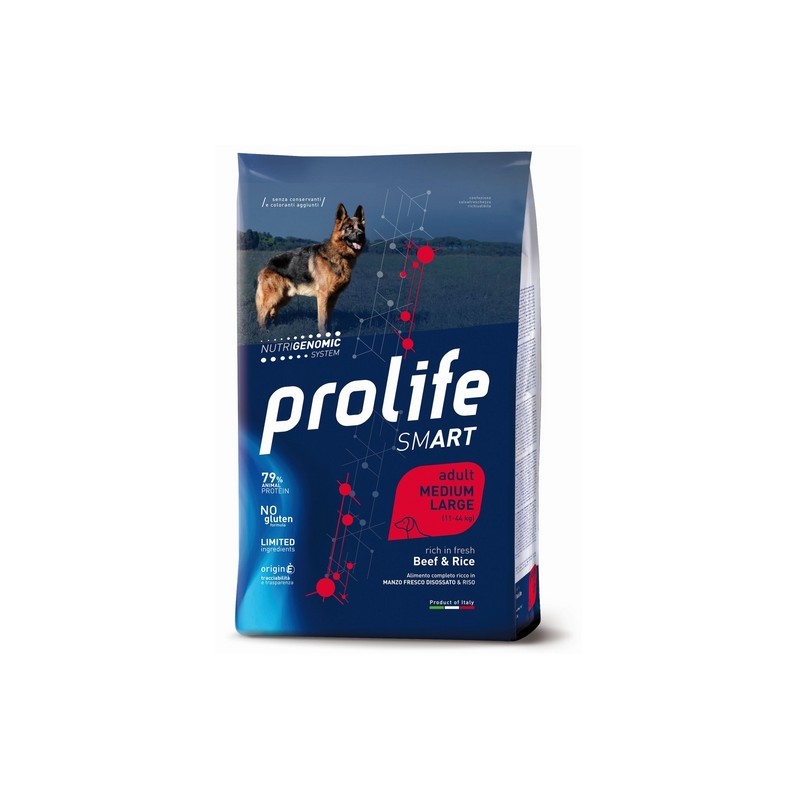 Smart Adult Beef & Rice - Medium/Large Alimento completo ricco in MANZO FRESCO DISOSSATO & RISO Manzo Fresco disossato e Riso per il cane adulto di taglia media e grande a partire da 12 mesi. ? Composizione Manzo 39% (di cui Manzo fresco disossato* 30%, Manzo disidratato 9%), Riso* 19%, Sorgo bianco*, Polpa di barbabietola, Grasso di pollo, Pollo disidratato, Proteine animali idrolizzate, Maiale disidratato, Alltech® Nutrigenomic System Adult Dog 1,2%, Sostanze minerali, Inulina di cicoria - fonte di FOS - 0,1%, Glucosamina 0,037%, Solfato di condroitina 0,026%. * in origine destinati al consumo umano: materie prime della stessa qualità utilizzata per alimenti per il consumo umano ma non a esso destinate per motivi commerciali. ? Componenti analitici Proteina 25%, Teno