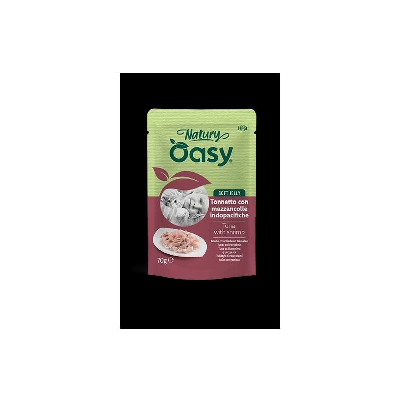 OASY Natury Soft Jelly Buste Tonnetto con mazzancolle è un Alimento umido complementare per gatti adulti in busta da 70 gr completamente naturale senza aggiunta di alcun prodotto chimico, colorante o conservante.