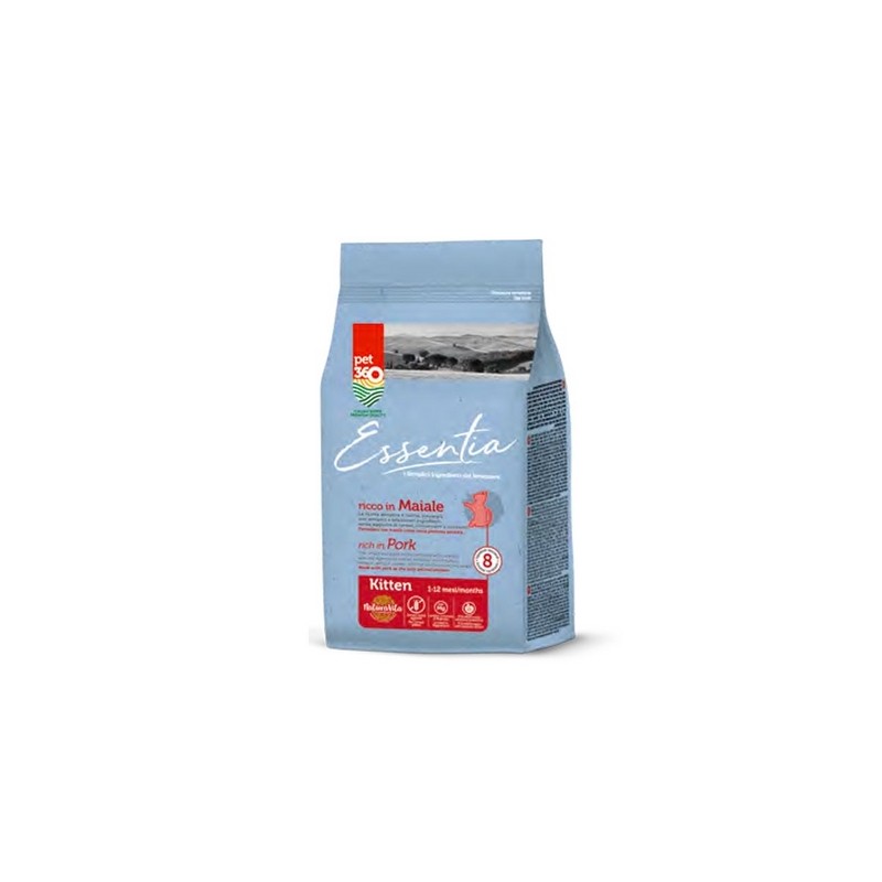 Essentia Kitten al Maiale Grain Free è un alimento completo per gattini a partire dalle 3 settimane di età. Le crocchette sono create per supportare l'attivazione del sistema immunitario e per favorire lo sviluppo del sistema scheletrico e muscolare grazie all'alta percentuale di maiale, unica fonte proteica di origine animale presente nella ricetta. Alla carne sono aggiunti patate e piselli, come fonte di carboidrati, e fibre benefiche FOS - MOS e mela, per una forte azione prebiotica. Inoltre vi è una percentuale di estratti botanici che sono ottimi antinfiammatori, antiossidanti e promuovono il sostegno delle funzioni organiche e cognitive. Informazioni prodotto Il cibo secco per gattini Essentia Kitten al Maiale Grain Free è un alimento completo per i pelosetti a partire dalle 3 settimane di età. Essentia Kitten al Maiale Grain Free per Gattini è pensato per gatti in crescita, ed è creato per supportare l’attivazione del sistema immunitario e per favorire lo sviluppo del sistema scheletrico e muscolare grazie all’alta percentuale di maiale, unica fonte proteica di origine animale presente nella ricetta, che è arricchita con patate e piselli come fonte di carboidrati, e fibre benefiche FOS – MOS e mela, per una forte azione prebiotica. Inoltre, come in tutte le crocchette per gatti Essentia, vi è una percentuale di estratti botanici, come rosmarino, curcuma, chiodi di garofano, agrumi e lievito che sono ottimi antinfiammatori, antiossidanti e promuovono il sostegno delle funzioni organiche e cognitive. 100% senza cereali, coloranti e conservanti aggiunti. Essentia Essentia è la linea di alimenti per gatti di Pet 360. Essentia mira a soddisfare le esigenze nutrizionali in tutte le fasi e i momenti di vita del felino. Ricerca, innovazione e passione sono alla base della produzione di un alimento buono, sano e che renda felice gli amici a 4 zampe. Ogni ricetta è specificatamente formulata pensando al benessere dell’animale: pochi ingredienti ma accuratamente selezionati e sapientemente combinati, tra carne, pesce ed estratti botanici, per rendere l’esperienza del pasto un momento di gioia per il gatto. Le ricette sono create seguendo le regole di Respect 360, il protocollo etico a cui l’azienda aderisce per garantire integrità e benessere di persone, animali e ambiente. Essentia, i semplici ingredienti del benessere. Proteine di suino disidratate 56% (prosciutto disidratato 15%), patata disidratata, piselli disidratati, grasso animale, polpa di mela disidratata, minerali, fruttoligosaccaridi (FOS) 0,3%, miscela di erbe e lieviti (0,24%).