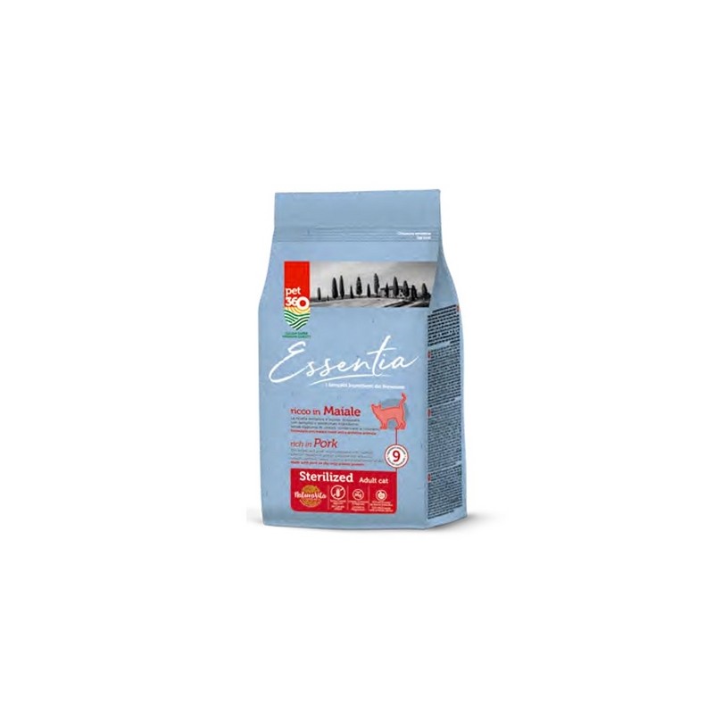 Essentia Adult Sterilized al Maiale Grain Free è un alimento completo per gatti sterilizzati e tendenti al sovrappeso. Le crocchette sono a base di maiale come unica fonte proteica. Al maiale sono aggiunti patate e piselli, come fonte di carboidrati, e fibre benefiche FOS - MOS e mela, per una forte azione prebiotica. Inoltre vi è una percentuale di estratti botanici che sono ottimi antinfiammatori, antiossidanti e promuovono il sostegno delle funzioni organiche e cognitive. Il cibo secco per gatti Essentia Adult Sterilized al Maiale Grain Free è un alimento completo pensato per gatti sterilizzati e con tendenza al sovrappeso. Essentia Adult Sterilized al Maiale Grain Free per Gatti è composto da Maiale come unica fonte proteica di origine animale presente nella ricetta, che è arricc