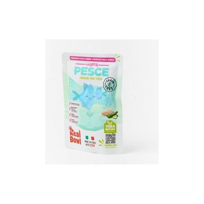 PESCE GATTO GRAIN FREE Real Bowl Pesce Grain free è un alimento completo per gatti con unica fonte proteica di origine animale. Le ricette Real Bowl contengono alimenti freschi in origine destinati al consumo umano. Il prodotto è da considerarsi come un pasto sostituivo per la dieta casalinga e vanta la comodità di poterlo utilizzare velocemente e conservarlo a temperatura ambiente. Composizione Pesce (70%), zucchine (5%),sostanze minerali. Componenti Analitici Umidità 77%, Proteina 12,5%, Grassi grezzi 7.5%, Ceneri grezze 1,4%, Fibra grezza 0,2% Additivi Vitamine: Vitamina A 3500 UI, Vitamina E 50 mg, Vitamina D 350 UI, Taurina 2000 mg,Biotina6 µg. Composti di oligoelementi: Zinco (zinco chelato di glicina)18 mg, Rame (rame chelato di glicina) 2 mg, Manganese (ossi