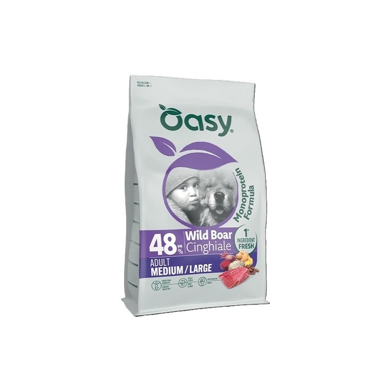 Le crocchette per cani Oasy One Animal Protein Adult Medium/Large Cinghiale sono l'ideale per i cani adulti di taglia media e grande con intolleranze alimentari, sensibilità intestinale e cutanea.