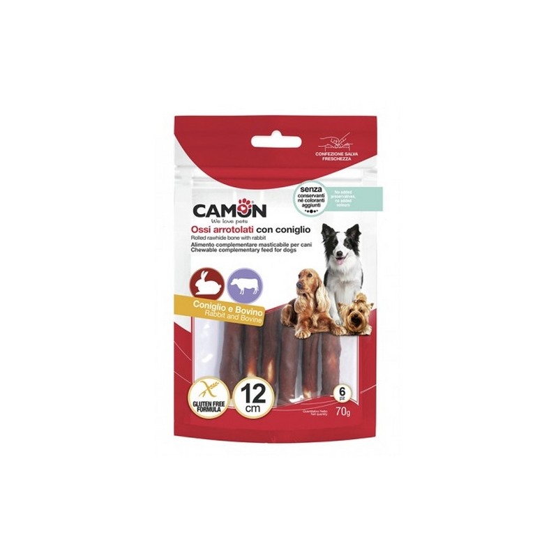 I Camon Rolls&Snack - Bovino e Pollo sono alimenti complementari masticabili per cani. Sono costituiti da un osso annodato di pelle bovina con pollo e sono privi di additivi. Ideali come snack premio o ricompensa. Lunghezza: 12cm Formato: 70g