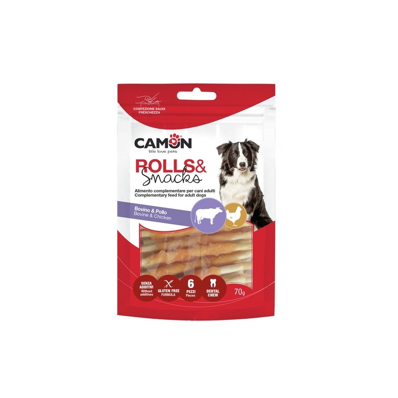 I Camon Rolls&Snack - Bovino e Pollo sono alimenti complementari masticabili per cani. Sono costituiti da un osso annodato di pelle bovina con pollo e sono privi di additivi. Ideali come snack premio o ricompensa. Lunghezza: 12cm Formato: 70g