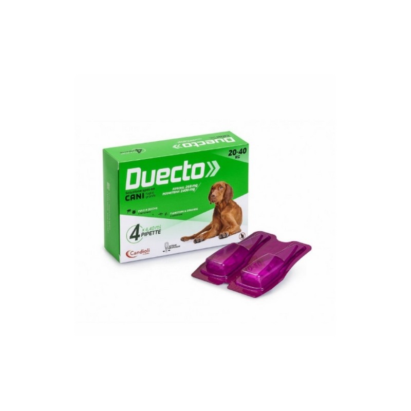 Candioli Duecto Spot On per cani è l'antiparassitario spot on che assicura un trattamento di prevenzione delle infestazioni da pulci e zecche, con efficacia repellente persistente contro le infestazioni da zecche. Caratteristiche Candioli Duecto Spot On 4 pipette per cani è un efficace antiparassitario che assicura un trattamento di prevenzione delle infestazioni da pulci e zecche. Impedisce la moltiplicazione delle pulci, bloccando la schiusa delle uova e la comparsa di uova deposte dalle pulci adulte ed ha efficacia repellente persistente contro le infestazioni da zecche. Caratteristiche principali: Confezione da 4 pipette Spot-On per uso esterno Efficace supporto per ridurre pulci e zecche Repellente (anti-puntura) contro i flebotomi e/o zanzare Protegge l'animale d
