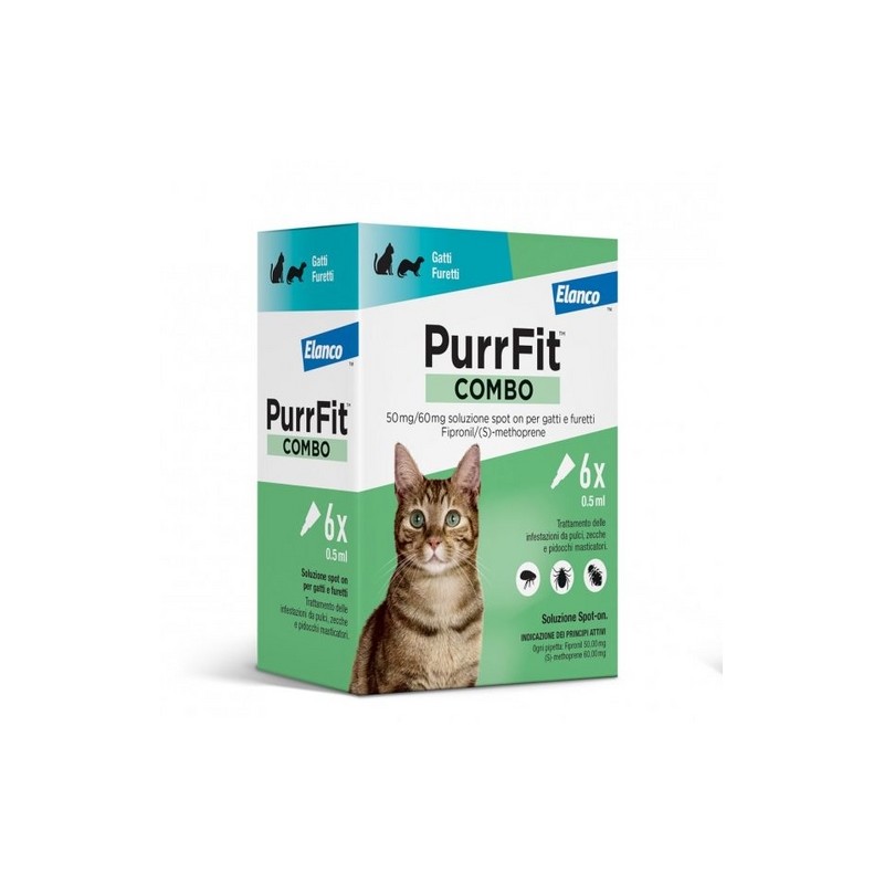FOGLIETTO ILLUSTRATIVO 1. Denominazione del medicinale veterinario Purrfit Combo 50 mg/60 mg soluzione spot-on per gatti e furetti 2. Composizione Ogni pipetta da 0,5 ml contiene: Sostanze Attive: Fipronil 50,00 mg (S)-methoprene 60,00 mg Eccipienti: Butilidrossianisolo (E320) 0,10 mg Butilidrossitoluene (E321) 0,05 mg Soluzione limpida color ambra 3. Specie di destinazione Gatto e furetto. 4. Indicazioni per l’uso Nei gatti: - Da utilizzare contro le infestazioni da pulci, da sole o associate a zecche e/o pidocchi masticatori. - Eliminazione delle pulci (della specie Ctenocephalides spp.). Prevenzione di nuove infestazioni da pulci adulte per 4 settimane. Prevenzione della moltiplicazione delle pulci mediante il blocco dello sviluppo d