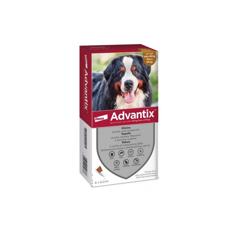 Advantix Spot-on in confezione da 6 pipette (6 ml), antiparassitario per cani di taglia grande con peso compreso tra 40 kg e 60 kg, utile per il trattamento e la prevenzione delle infestazioni da pulci (C. canis, C. felis) e per il trattamento del pidocchio (Trichodectes canis) nei cani Adatto anche per cuccioli dalle 7 settimane di vita. Il prodotto è contenuto in pipette monorazione di semplice applicazione. Tutte le caratteristiche di Advantix® Spot-on per cani oltre 40 kg fino a 60 kg: Prodotto farmaceutico Specie di destinazione: cane Per il trattamento e la prevenzione delle infestazioni da pulci (C. canis, C. felis) e per il trattamento del pidocchio (Trichodectes canis) nei cani. Spot-on per cani di peso compreso tra 40 kg e 60 kg. Le pulci sui cani vengono