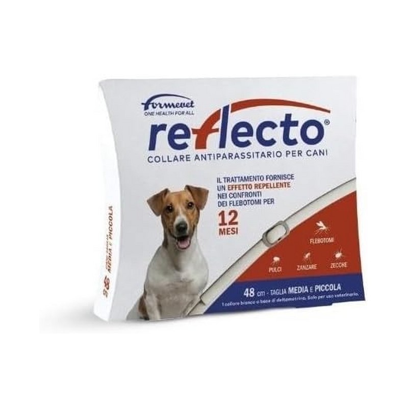 Reflecto è un collare antiparassitario per cani di 48 cm. Il suo principio attivo è la deltametrina, un ectoparassiticida efficace contro pulci, zecche e zanzare. Il collare offre una protezione di 6 mesi contro le zecche, 4 mesi contro le pulci e 6 mesi contro le zanzare adulte. Inoltre, ha un effetto repellente sui flebotomi per 12 mesi, riducendo il rischio di trasmissione di leishmaniosi viscerale nel cane. Il collare può essere utilizzato nei cuccioli di età superiore a 7 settimane. In caso di irritazione locale marcata o di reazione allergica, il collare deve essere rimosso immediatamente. Indicazioni Terapeutiche Reflecto 1 è indicato per la prevenzione delle infestazioni da zecche per 6 mesi, prevenzione delle infestazioni da pulci per 4 mesi, effetto repellente sulle zanzare
